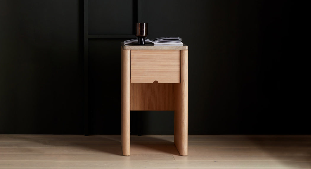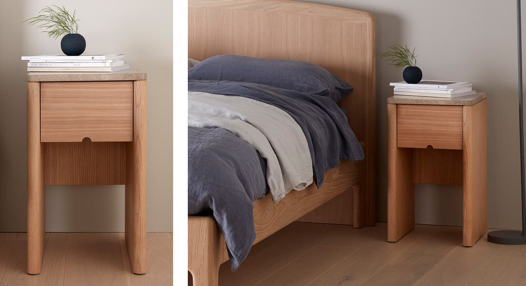The Millicent bedside table is built from solid European Oak and finished with a sleek marble top.