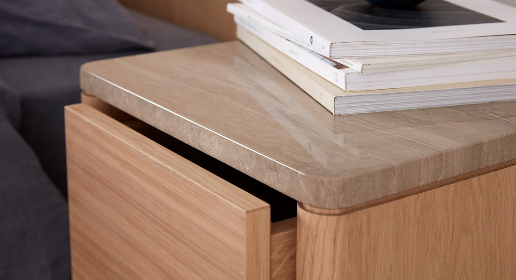 Where the natural grain of oak reaches the organic vein of marble, two perfectly imperfect finishes meet in harmony. Clean lines and a simple, smooth drawer pull result in a perfectly-proportioned bedside table.