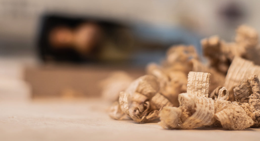 A handful of wood shavings created by Jezza in the workshop.