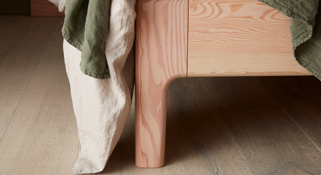 With the appearance of being hewn from a single piece of wood, the Henry is almost whimsical in its design, with floating bedside tables and clean drawer pulls. But the quiet lines allow the shape to step back, with the expressive character of this glorious wood taking centre stage.